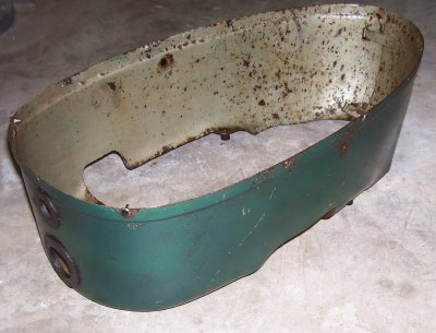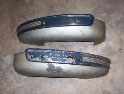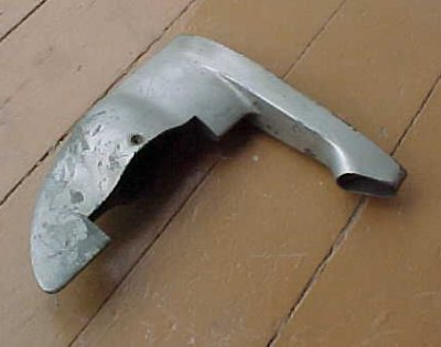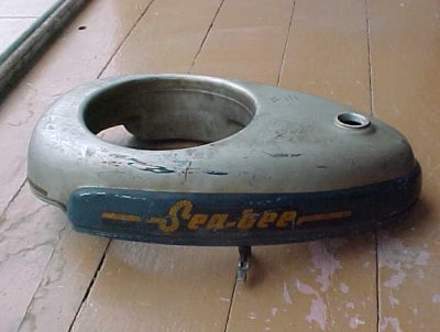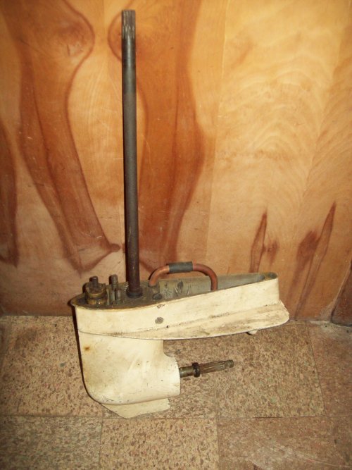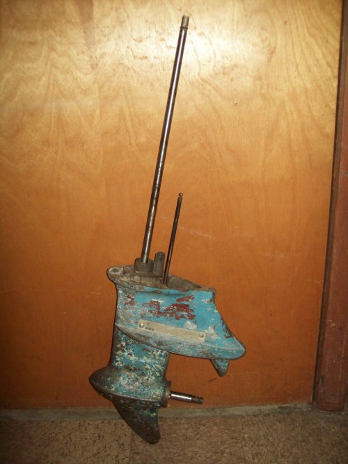 Years:1962 style; Merc 450 or 500 long shaft lower gear housing assembly. This is the style with the water pickup in the trim tab. It could be used on motors up to 1964. It seems to be in good condition. It is marked as having a new impeller, but has been sitting many years. |