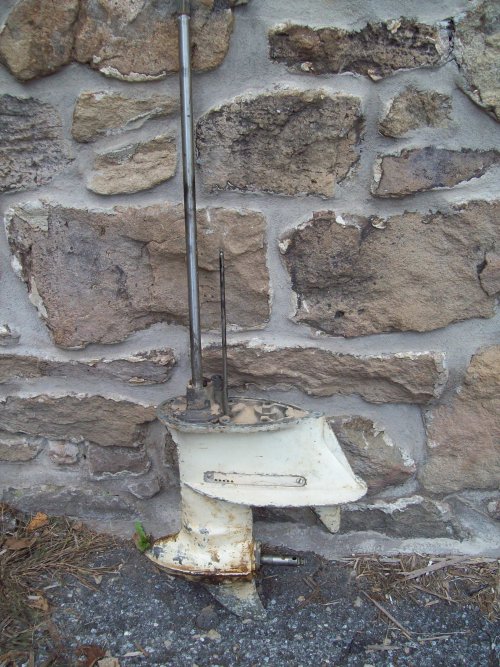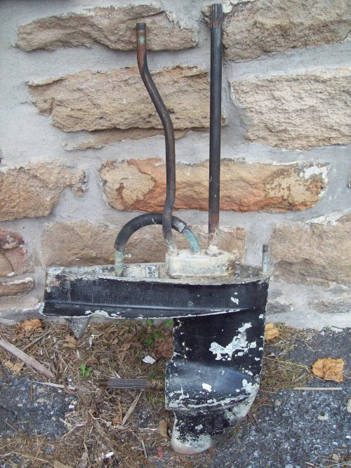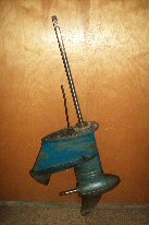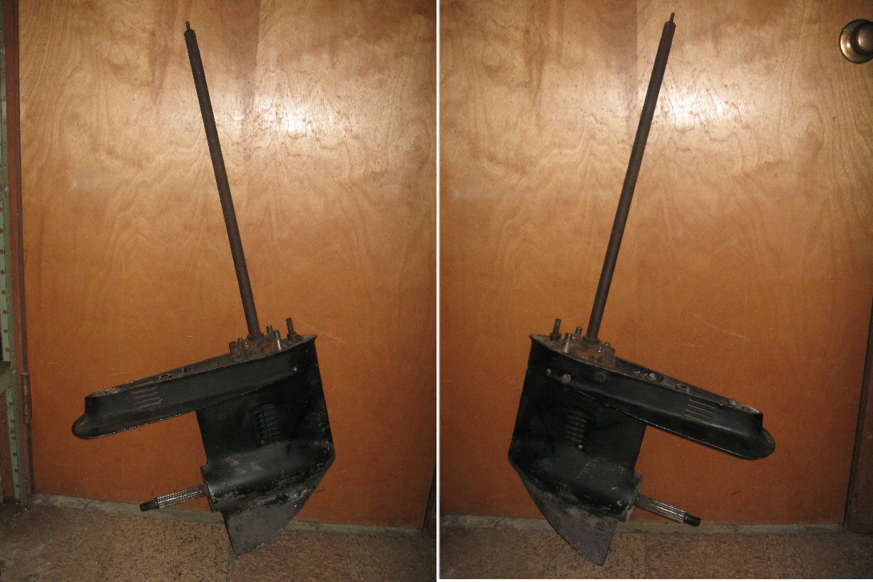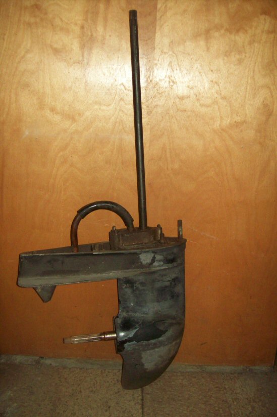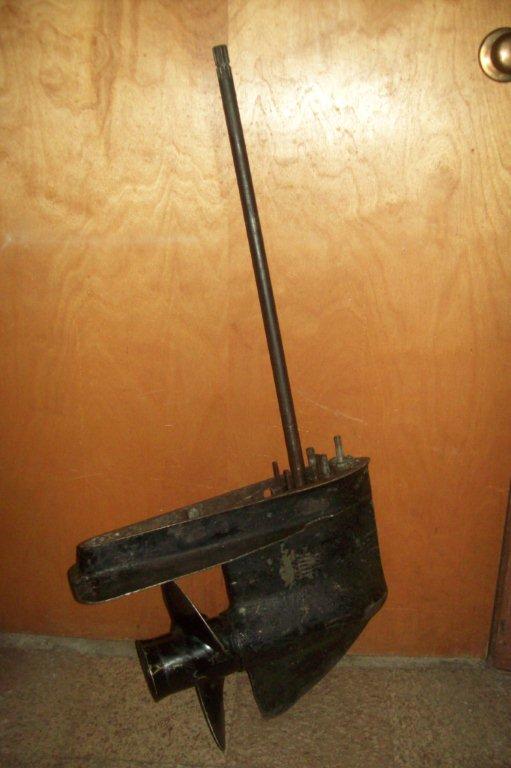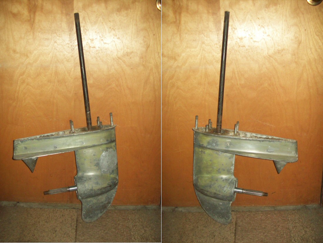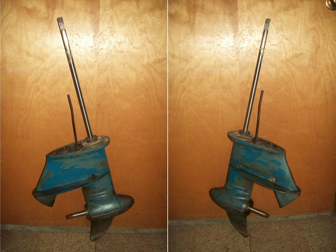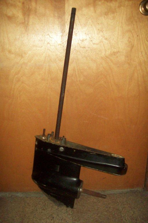 Years:1963-64; 50hp long shaft gear housing assembly. This unit turns and shifts fine. It has a 3 blade 9� pitch aluminum prop that is stuck on the shaft. All waterpump parts are gone or need replacement. There is a piece out of the forward edge of the starboard cavitation plate. The end of the threads on the propshaft have been expanded from someone trying to get the prop off. This will also fit 62 50hp models. |