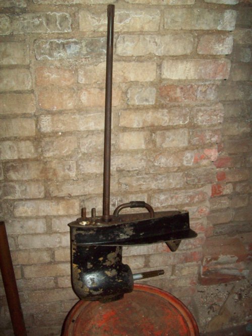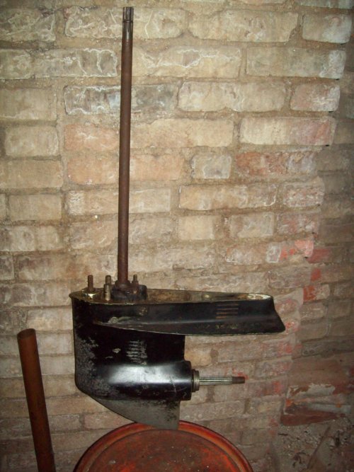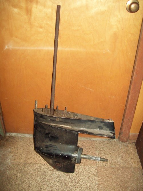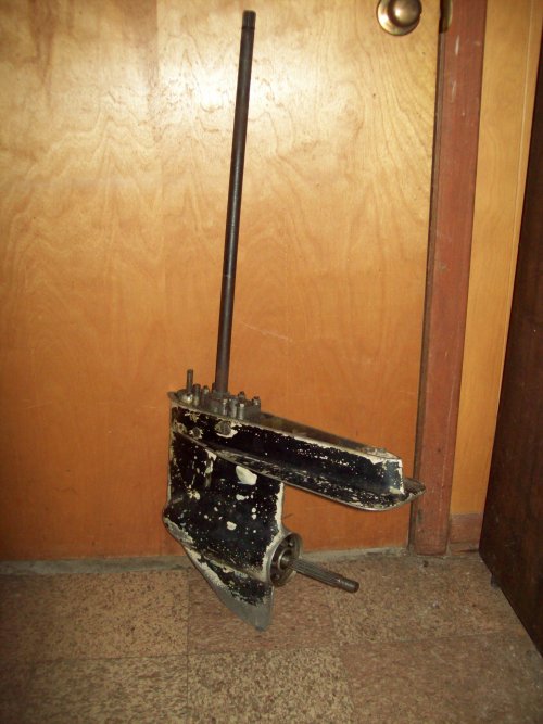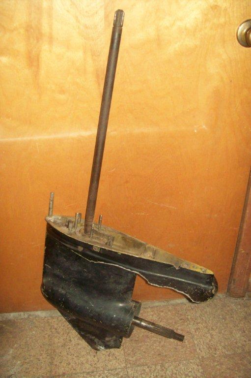 Years:1955-59; Mark 55-58 type long shaft lower gear housing assembly with 3/8inch mounting studs. Most of the skeg needs to be replaced. Seems to turn and shift OK. The prop shaft splines are poor. |