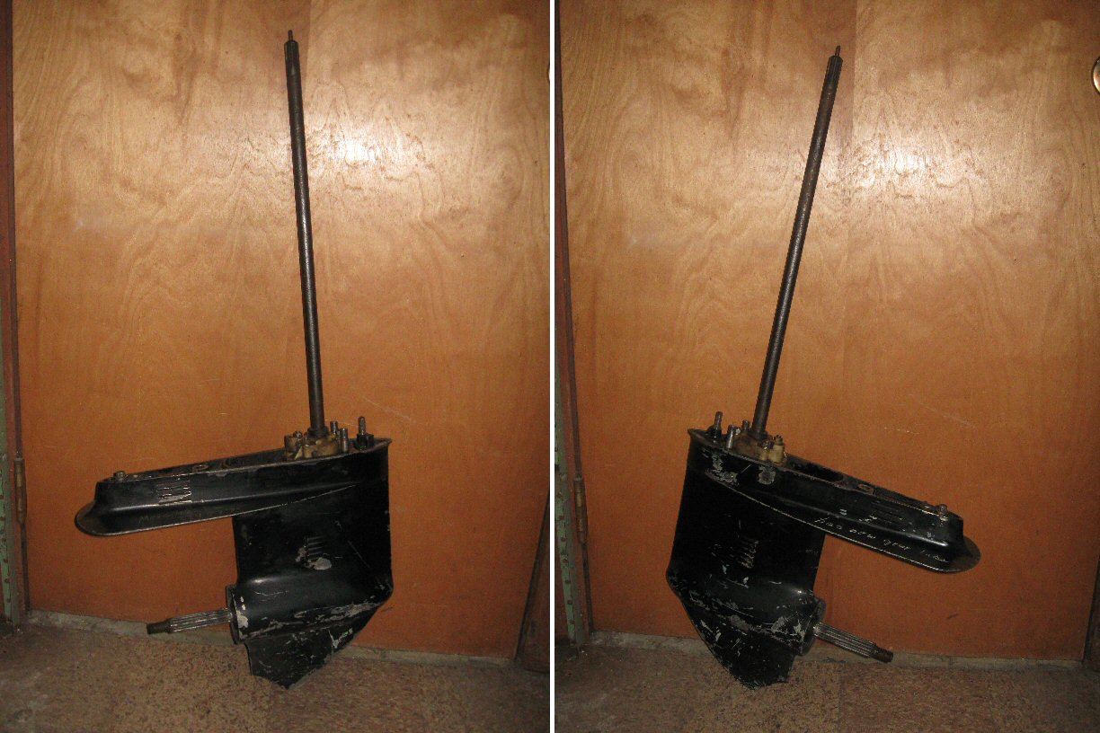 Years:1970-mid 1972; 40-50hp long shaft gear housing assembly. Correct 2:1 gear ratio. Has a piece off the bottom of the skeg. Feels and shifts good. Marked that it has new gear oil. This has the narrower front stud spacing used up to mid 1972. Probably could be used on late 60�s 35-50hp models to update to the more common 13 spline props. |
