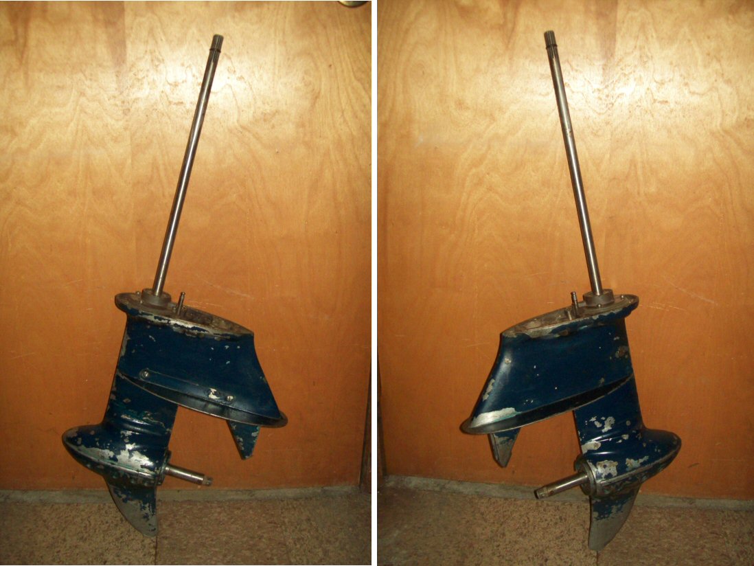 Years:1955 to early 1959; 35 to 45hp long shaft lower gear housing assembly. Has the 3/8inch mounting studs of this time period. Seems mechanically good. Has a piece broken off the rear of the caviataion plate and a chip out of the edge of the housing ahead of the prop. |